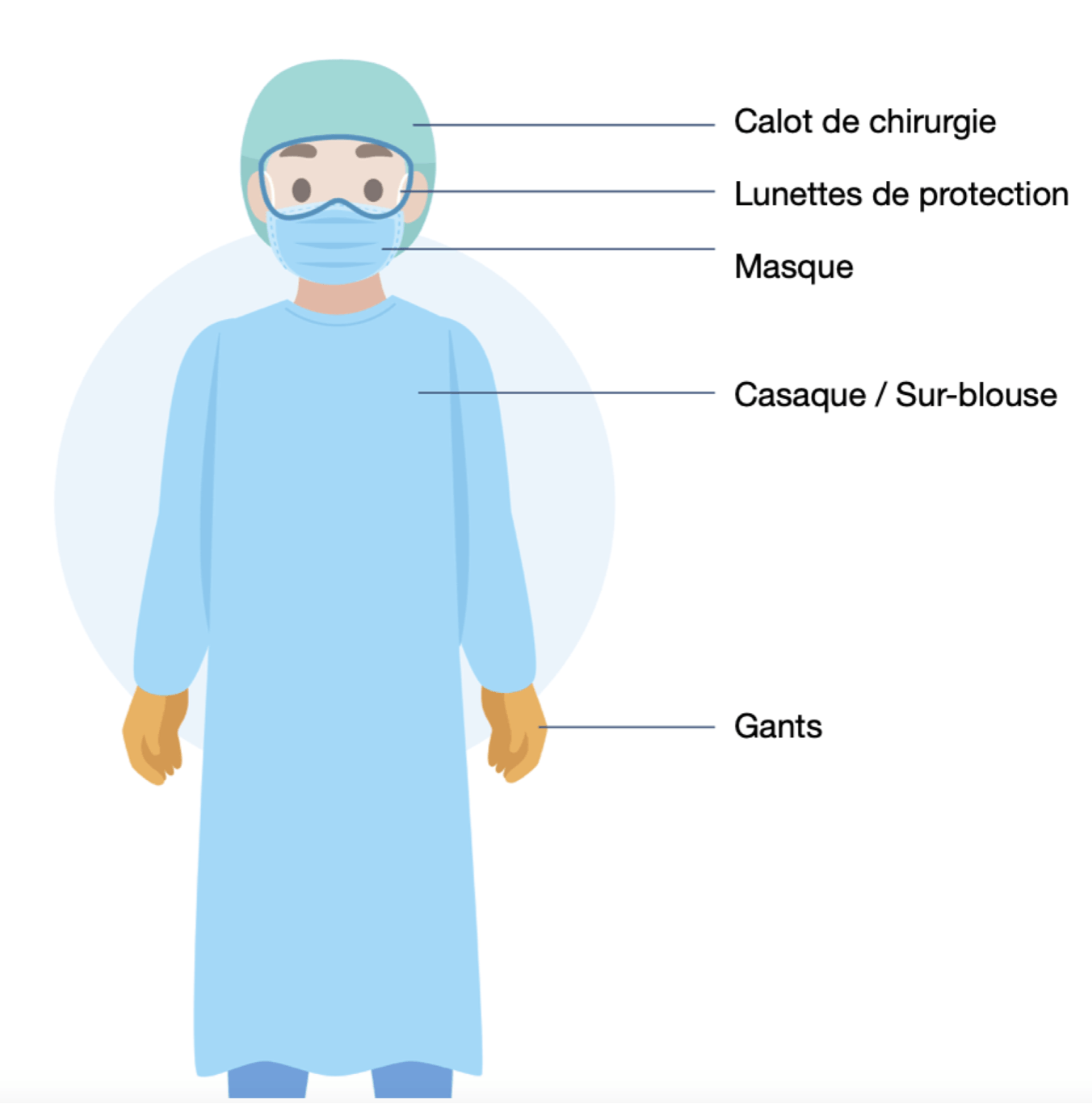 Can be added to the usual outfit: cap, protective glasses,high filtration mask and overcoat changed for each patient.